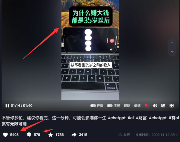 在抖音\视频号上已经有很多人利用ChatGPT做热点视频的案例了,视频都是点赞大几千、几万。看完本文,你会略知一二,如下图所示: